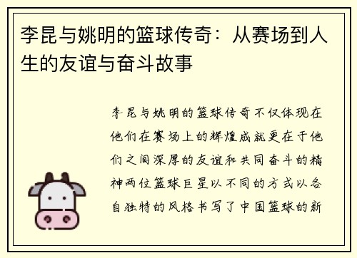 姚明,作为中国篮球的代表性人物,他的职业生涯充满了传奇色彩。从一个普通的少年成长为国际篮球舞台上的巨星,姚明不仅在技术上取得了卓越成就,更是将中国篮球推广到了全球。他的飞跃之路从上海的一块小球场开始,经过艰苦训练进入NBA,再到如今成为国际篮球联合会理事和慈善事业的积极参与者。本文将从四个方面详细阐述姚明的传奇故事:他的早期经历、NBA生涯的辉煌、退役后的贡献以及对未来中国篮球发展的影响。这些方面...
